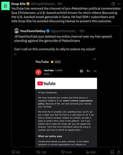 arrow-up11arrow-down1imageYoutube bans pro-Palestine creator Guy Christensen shortly after his Instagram ban and TikTok demonitizationlemmy.mlgeneva_convenience@lemmy.ml to Technology@lemmy.ml · 7 days agomessage-square0linkfedilinkfile-text